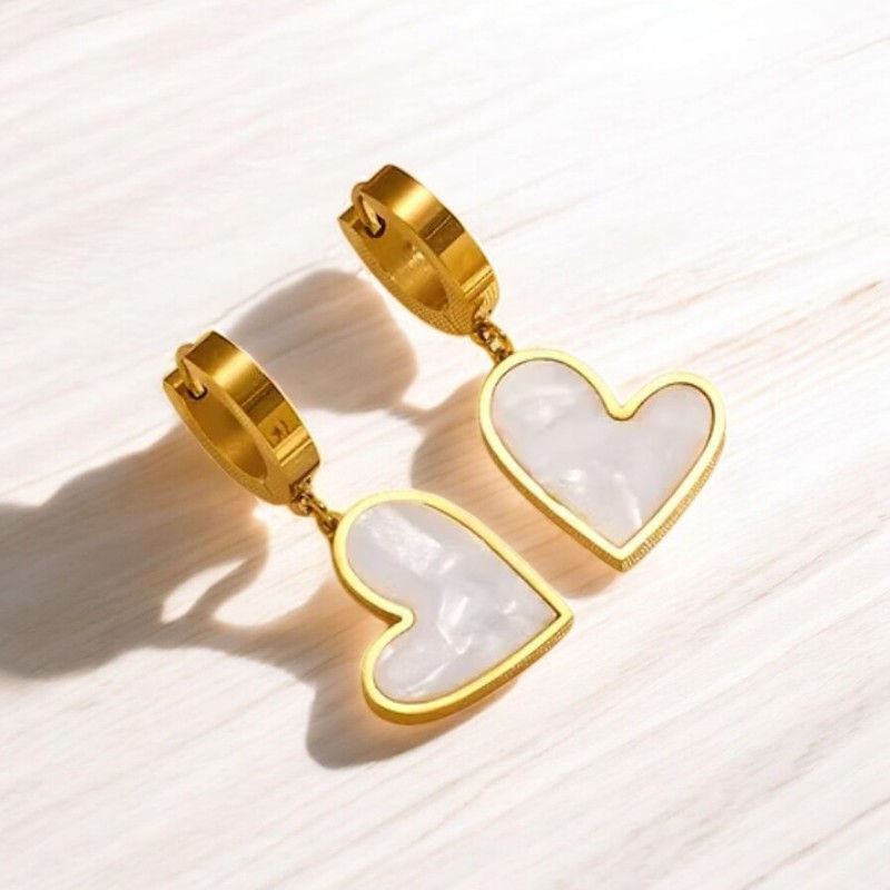 Embrace a touch of princess-inspired charm with these gold hoops featuring a delicate white shell heart attachment. Plated in 18K gold, these cute and simple earrings showcase a heart-shaped acrylic inlay, making them a perfect accessory for a whimsical yet elegant look.